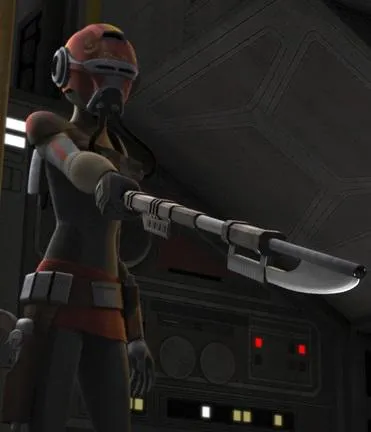L'ancienne Cadette Impériale Ketsu Onyo fut, comme beaucoup de ses concurrents chasseurs de primes, une experte dans le maniement des armes. Ainsi, après qu'elle eut abandonné son amie Sabine Wren et décidé de rejoindre le Soleil Noir, Onyo maniait un bâton très particulier. Ressemblant à une vibrolame portée par exemple par les Gardes de Jabba, le Bâton de Ketsu Onyo pouvait également être utilisé comme un blaster. En définitive, et à l'instar du Sabrelaser d'Ezra Bridger, cette arme servait tout aussi bien au corps à corps qu'à distance. La chasseuse de primes le portait dans le dos de son armure afin de pouvoir la dégainer rapidement. Quelques temps après le Blocus d'Ibaar, Onyo fut envoyée retrouver le droïde EG-86 sur Garel. Sa mission prit une toute autre tournure quand elle retrouva Sabine, également envoyée retrouver l'automate pour les Rebelles de Lothal et la Cellule Phénix. Malgré tout, la chasseuse n'en oublia pas ses réflexes et fut à même de neutraliser une escouade complète de Stormtroopers avec son bâton modifié.
