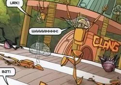 Alors que les deux compagnons retournaient sur leurs pas afin de continuer leurs investigations, un droïde les répara aux commandes d'un véhicule monoplace de patrouille. Au même moment, des centaines de petits insectes formèrent un impressionnant nuage qui enveloppa l'appareil et son pilote. Déséquilibré, l'engin s'écrasa. Une fois la menace écartée, ils invitèrent la Padawan et son Maître à les suivre en formant une sorte de flèche à l'intérieur d'un arbre creux qui menait à une salle souterraine. Après une rapide descente, les Jedi arrivèrent dans une pièce où d'autres essaims identiques étaient rassemblés. La native de Shili en déduisit aussitôt que ces minuscules êtres intelligents étaient la population locale ! Les milliers d'espèces différentes qui peuplaient la Galaxie arboraient bien évidemment des formes diverses et variées. Les Hakariens étaient donc à l'origine de l'alerte reçue sur Coruscant. Toutefois, la technologie qui avait été employée pour l'envoyer reste encore inconnue. Quoi qu'il en soit, l'Elu réussit à faire comprendre, à l'aide de la Force, aux natifs que le moyen le plus efficace pour neutraliser les automates était de mettre hors service leur processeur neural.