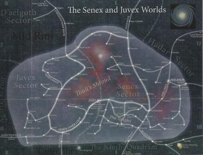 Le Secteur Senex était situé dans le Neuvième Quadrant de la Bordure Médiane, à proximité du secteur Juvex et de la Route Commerciale de Rimma. Ses principales planètes sont Karfeddion, Veron, Mussubir III, Garnib, Hutlar, Neelanon, Ossel II mais aussi, situées plus en périphérie, les planètes de Yetoom Na Uun et de Belsavis. La particularité du secteur Senex tenait à sa forme de gouvernement. En effet, celui-ci était dirigé par une élite d'Anciennes Familles aristocratiques dont la plus prestigieuse était la Maison Vandron, dirigée par Lady Theala Vandron. Les maisons Elegin de Drost Elegin et Garonnin étaient également très puissantes. Les Anciennes Familles étaient connues pour ne pas respecter les Droits des Etres pendants, et leur richesse venait de fermes et d'industries minières basées dans les astéroïdes où travaillaient une multitude d'esclaves, dont un bon nombre était des mutants dont les conditions de vie étaient déplorables.